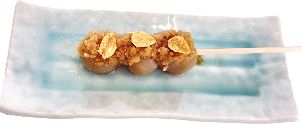 山形名物の玉こんにゃくの上に乗った、大根おろしとにんにくチップの組み合わせが最高!