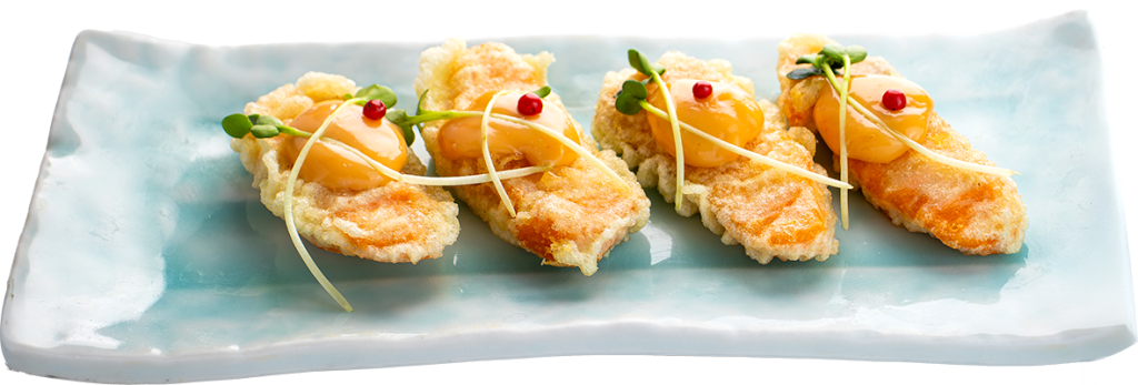 揚げたてでカリッとした食感のフリッターに、少し酸っぱみ感(レモン果汁)のあるソースがたっぷり乗っていておいしく頂ける逸品です。