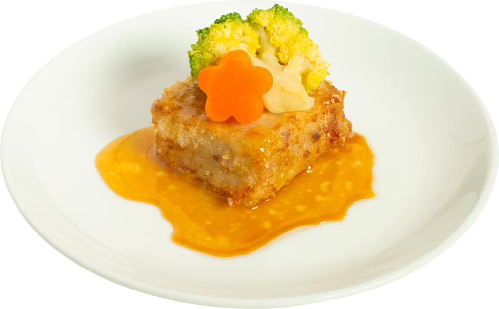 今が旬のレンコンをステーキ風で。レンコンはペースト状になっているので歯ごたえは楽しめませんが、揚げたてのホクホク感と甘みのあるソースとがマッチした逸品です。